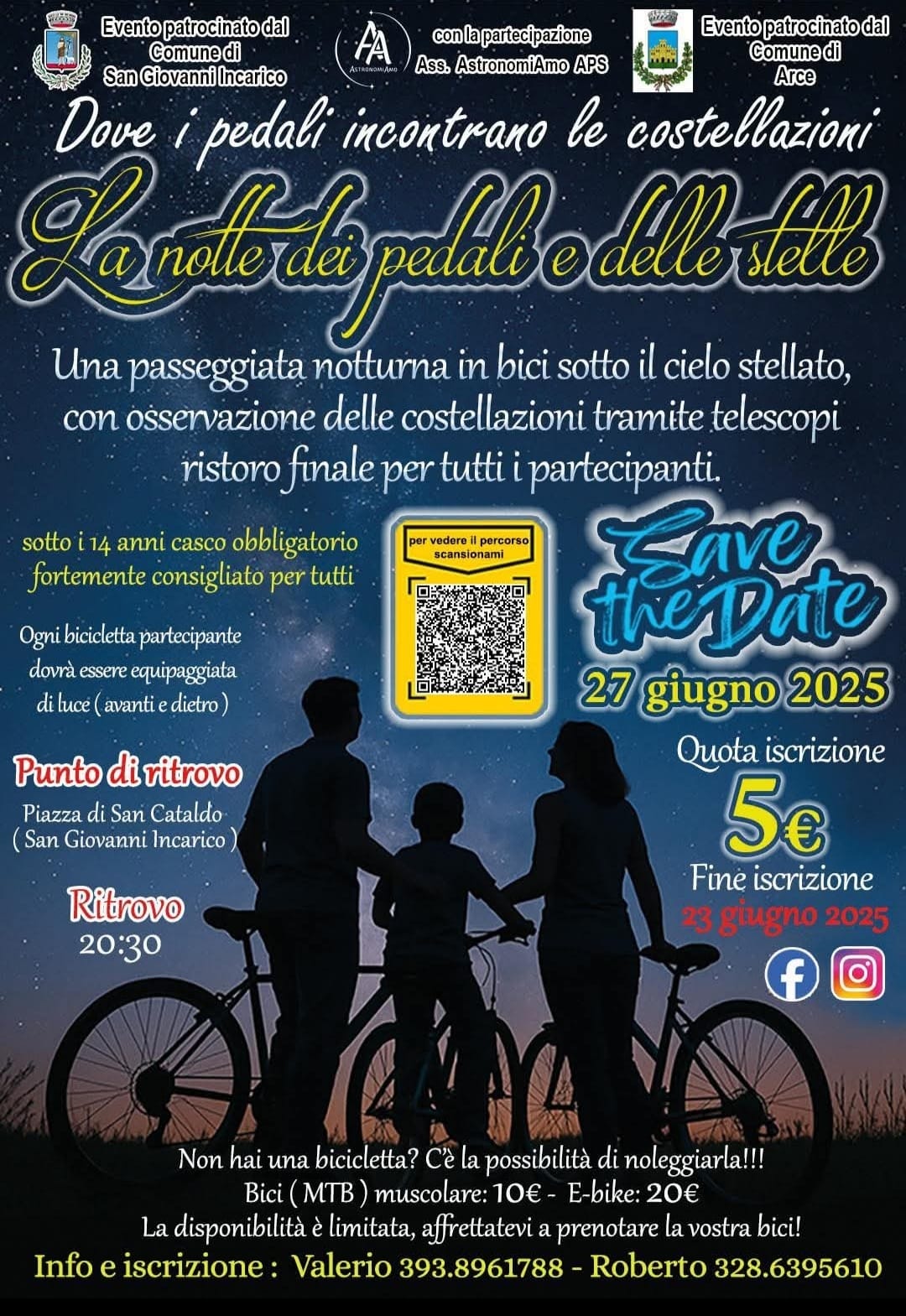Segnatevi la data: venerdì 27 giugno 2025 sarà la volta di un evento che promette di combinare l'amore per la natura, lo sport e l'astronomia: "La Notte dei Pedali e delle Stelle". Questa suggestiva passeggiata notturna in bici sotto il cielo stellato, arricchita dall'osservazione delle costellazioni e degli oggetti celesti tramite telescopio, si terrà a San Giovanni Incarico.